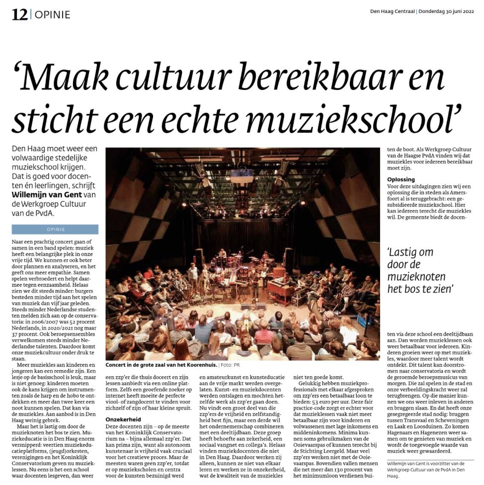 De stelling van de jaarlijkse discussieavond over cultuur in Den Haag was ‘De Muziekschool moet terug komen in Den Haag’. Ik had daarover een opiniestuk geschreven die in Den Haag Centraal is gepubliceerd. PvdA Café Rood cultuur 2022